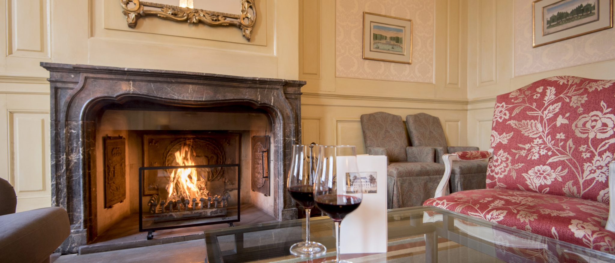 Hereinspaziert in den Salon: Direkt hinter der Eingangshalle wartet der Salon mit Annehmlichkeiten wie Kamin, Polstermöbeln und gediegenen Clubsesseln auf. Die historischen Wände sind mit gelbem Damast bespannt, der den gemütlichen und dennoch stilvollen Charakter des Raumes betont.